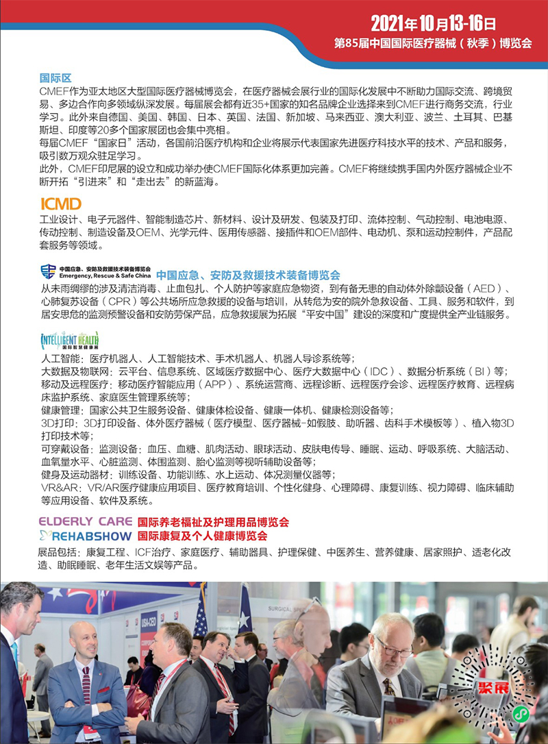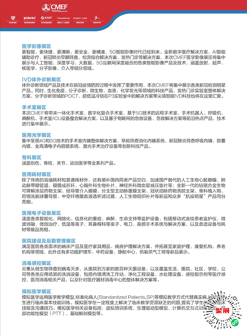 The China Shanghai Medical Equipment Expo (CMEF) in Shanghai will comprehensively innovate and upgrade in terms of exhibition area setting, conference activities, and exhibition models, covering the entire medical industry chain. It sets up exhibition areas such as medical imaging, in vitro diagnostics, medical electronics, medical optics, smart health, hospital construction, operating rooms, disinfection control, medical consumables, orthopedics, and hospital construction and back-office management, focusing on the development trends of each细分的细分领域of the industry, exploring the future development of the industry.
