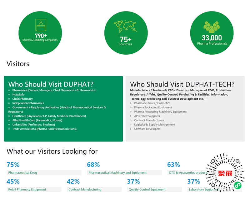 Middle East Dubai Pharmaceutical Exhibition (DUPHAT) is of great significance to practitioners in the pharmaceutical industry. The exhibition provides an opportunity to understand the pharmaceutical market and technological development trends in the Middle East, and also serves as a platform for exhibitors and visitors to communicate, cooperate, and promote industry development.