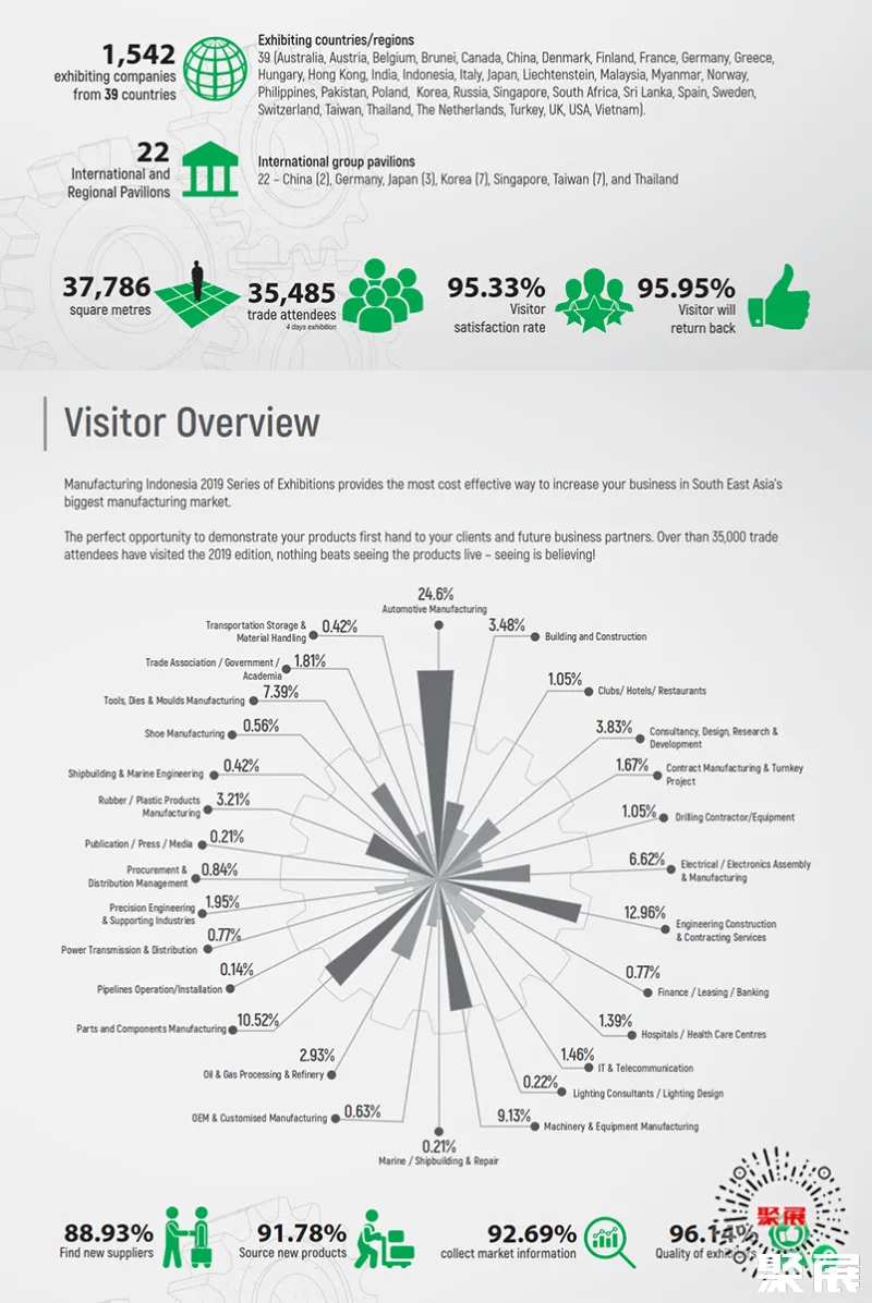 As the most professional manufacturing exhibition in Indonesia, it is recognized as one of the top 20 manufacturing exhibitions worldwide. Indonesia Jakarta Industrial Machinery Manufacturing Expo (Manufacturing Indonesia) had an exhibition area of 38,000 square meters last session, with 840 participating companies from China, the United States, Brazil, Russia, Thailand, India, Malaysia, Chinese Taiwan, Japan, etc., and the number of participants reached 36,164. (The content of this article is the exclusive copyright of JuZhan, without permission, it is forbidden to forward.)