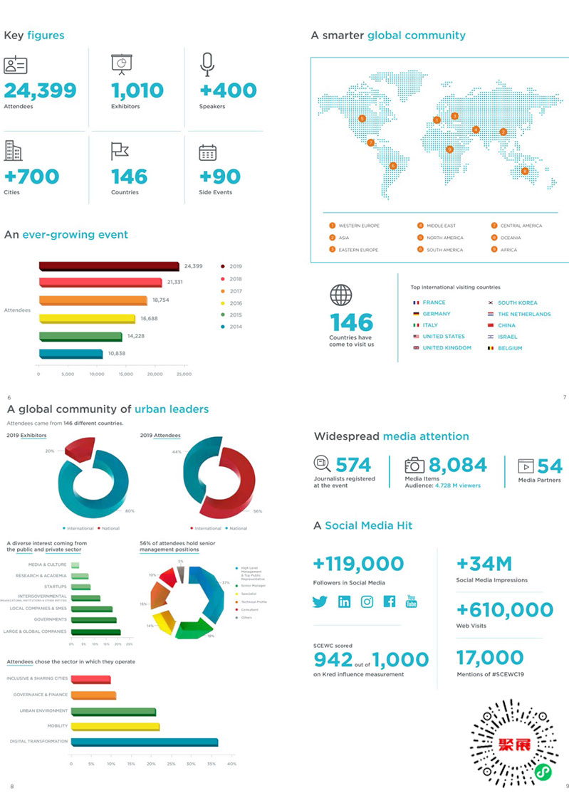 西班牙巴塞罗那全球智慧城市大会SCEWC期间,来自全球各个国家的二十多位省部级领导,五十多位市长和主抓智慧城市建设部门的领导共聚巴塞罗那。上届展会总面积58000平方米,参展企业1010家,参展人数达39000人。现场还有来自全球500多位演讲者,为各方创造大量的交流机会和沉浸式体验。