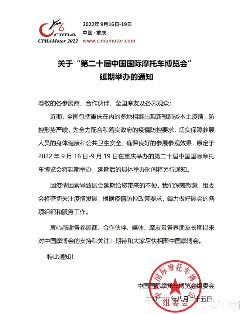 紧急通知:原定于2022年9月16-19日在重庆举办的第二十届中国国际摩托车博览会将延期举办