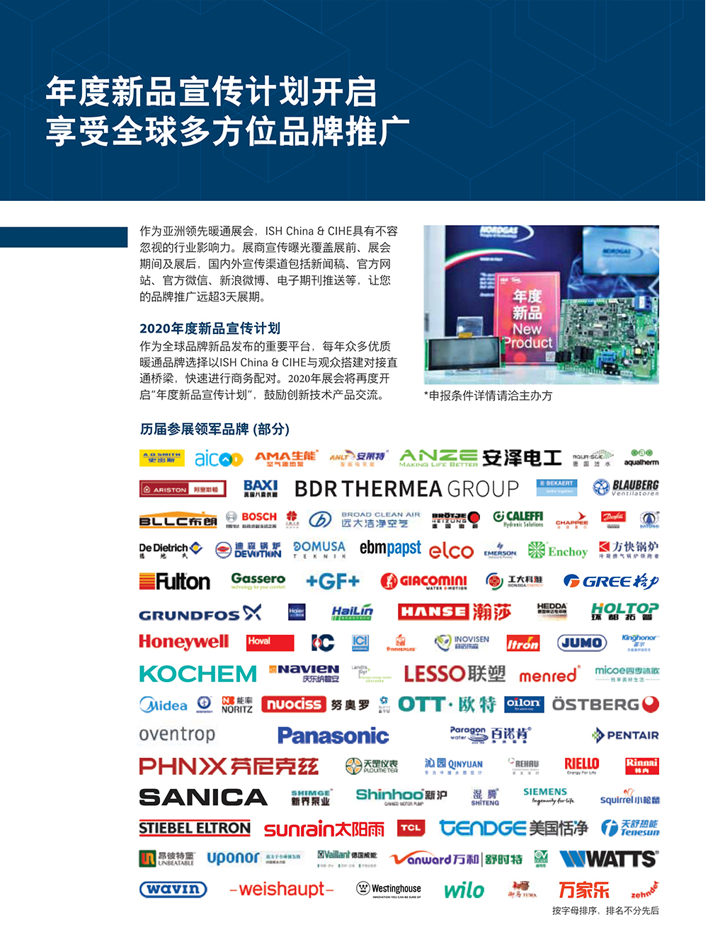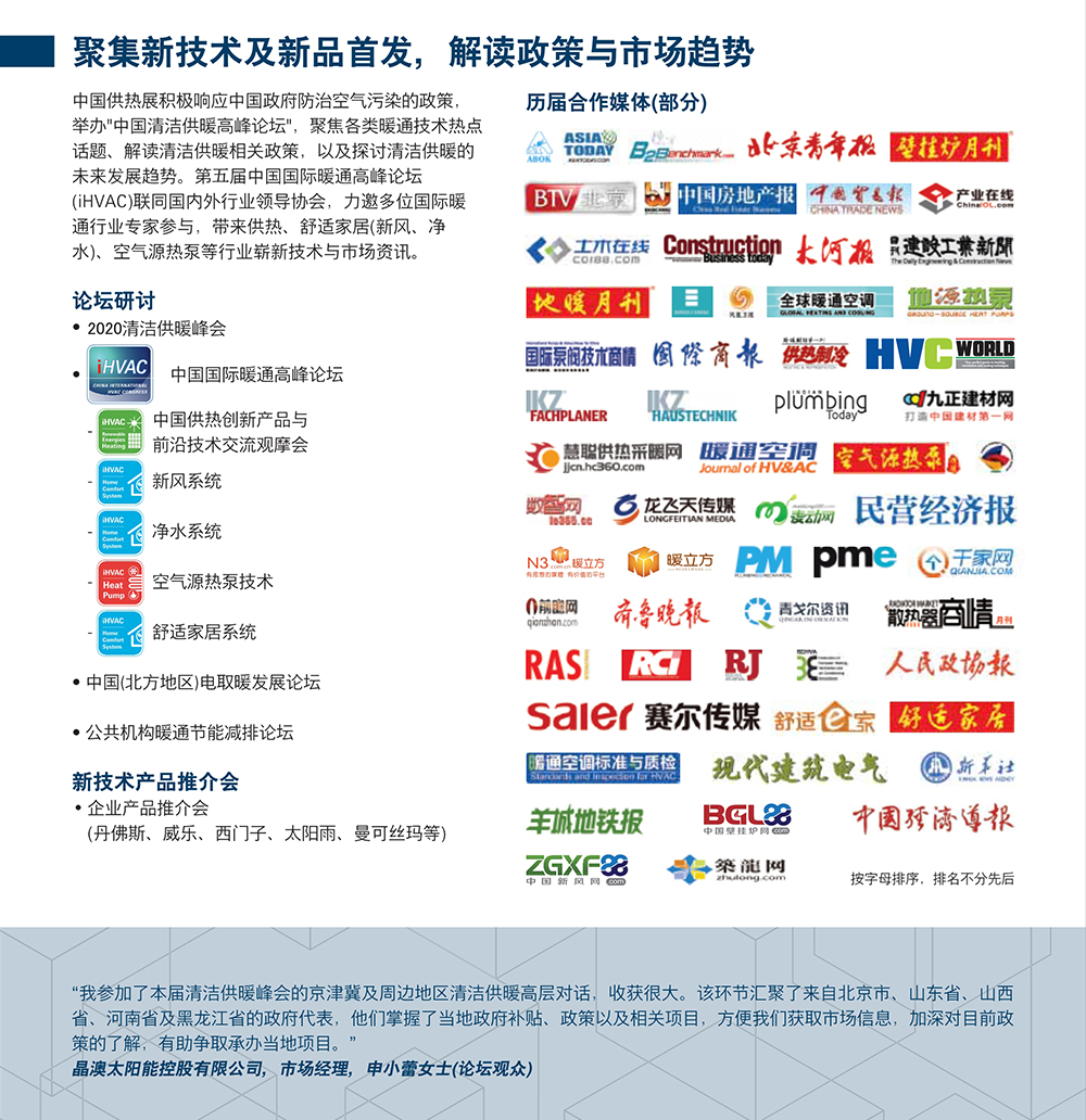 作为亚洲领先的贸易展,众多国内外知名品牌已积极回应,均已落实参展,包括爱客多、奥林、丹佛斯、方快、芬尼克兹、瑰都啦咪、海尔、嘉赛罗、科诺、利欧、利雅路、美的、纽恩泰、能率、派沃、四季沐歌、清华同方、万和、喜德瑞、西门子、正理生能及中广欧特斯等。