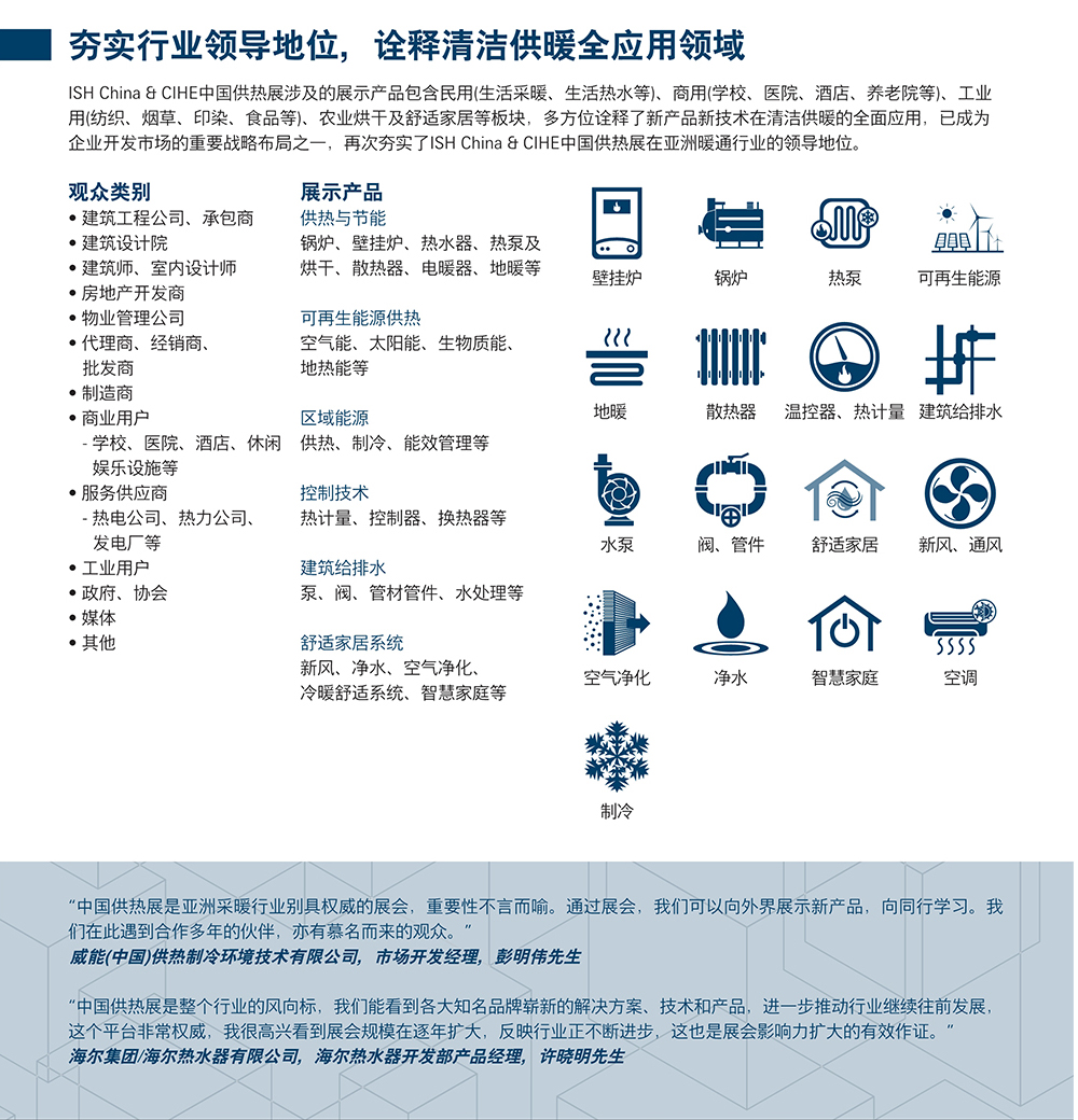 中国供热展-北京暖通卫浴展(ISH China & CIHE)展示了锅炉、壁挂锅炉、地板供暖、暖通、空调、环卫、家居舒适系统交易会。汇集全球暖通和管道行业的领先品牌方面,它有着卓越的业绩,打造中国舒适家居新生活。符合国家绿色能源政策,为暖通空调制造商和经销商搭建专业平台。