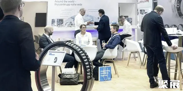 在另一个展馆22号馆,蒂森克虏伯带来了一个叫“三排滚柱轴承回转环”的新发明。这个圆形滚轴可应用于多个领域,比如风机涡轮上。展位上的工程师们,忙于向客户和参观者们展示这个大轴承是如何运行的。