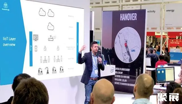 在6号展馆,蒂森克虏伯的工程师在向客户们讲述“如何连接工厂生产的最后一公里”。