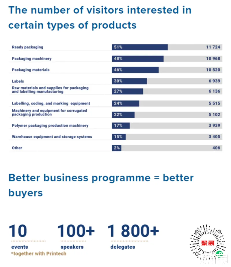 俄罗斯莫斯科包装工业展览会(RosUPack)汇集了来自俄罗斯79个地区和51个国家的30474名专业观众参观。这些观众主要是来自制药、包装、食品、化妆品等领域的企业负责人和部门经理,以及生产工程师和市场营销人员等。