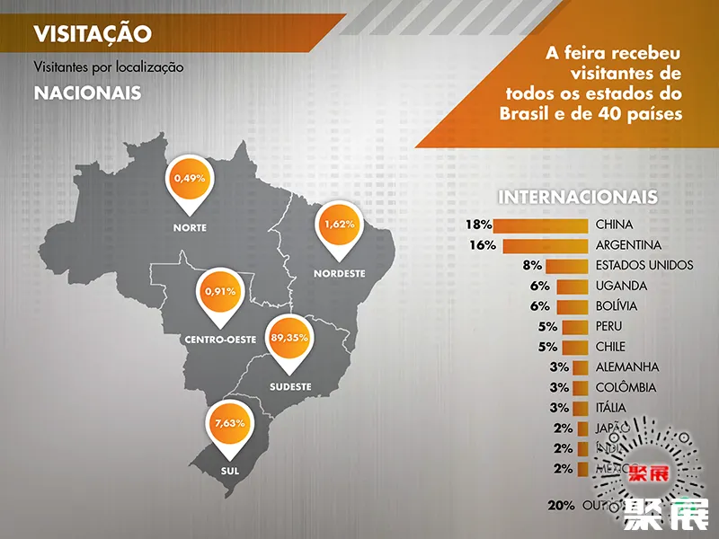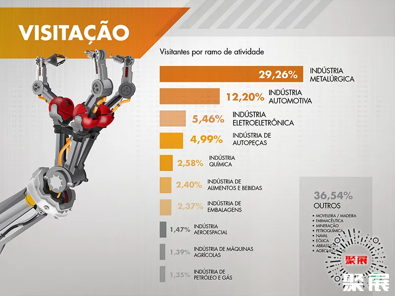 巴西圣保罗工业展览会(FEIMEC)上届展会总面积60000平方米,参展企业850家均来自中国、中国台湾、意大利、南非、西班牙、智利、美国、墨西哥、澳大利亚、加拿大等,参展人数达59000人。